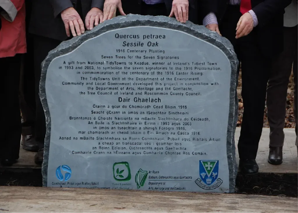 As winners of the Tidy Towns Competitions in 1993 and 2003, Keadue was gifted seven oak trees to represent the seven signatories to the Proclamation and these trees are planted at Lough Meelagh Amenity Site, just outside Keadue.