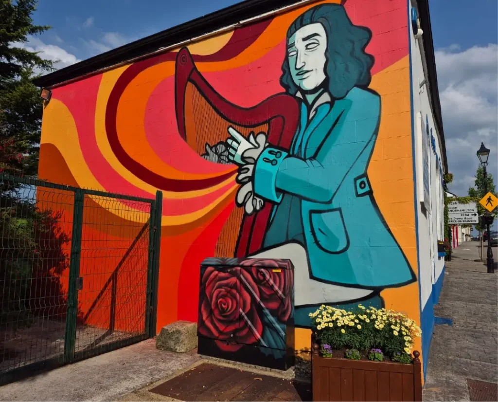 Several artworks can be seen in Keadue depicting our heritage e.g. bog-oak sculpture of musical instruments and a mural and a bog-oak harp in memory of O’Carolan designed and hand crafted by Brendan Collum as well as a display of plaques and medals denoting Keadue’s achievements in Tidy Towns Competitions over the years.
